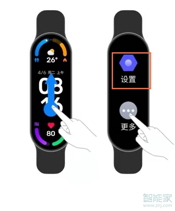 1、在手环的表盘上向上滑,找到设置按钮。