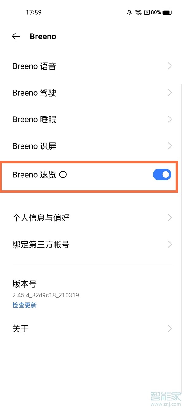 2、进入Breeno页面,将【Breeno速览】开关关闭即可。