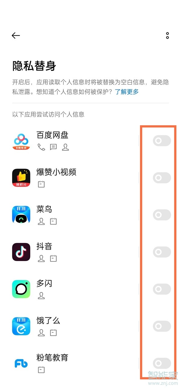 3、选择需要开启隐私替身的应用,将右侧的开关开启即可。