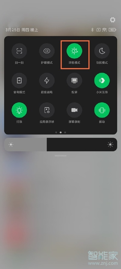 1、从屏幕顶部下拉,拉出状态栏,点击【深色模式】。