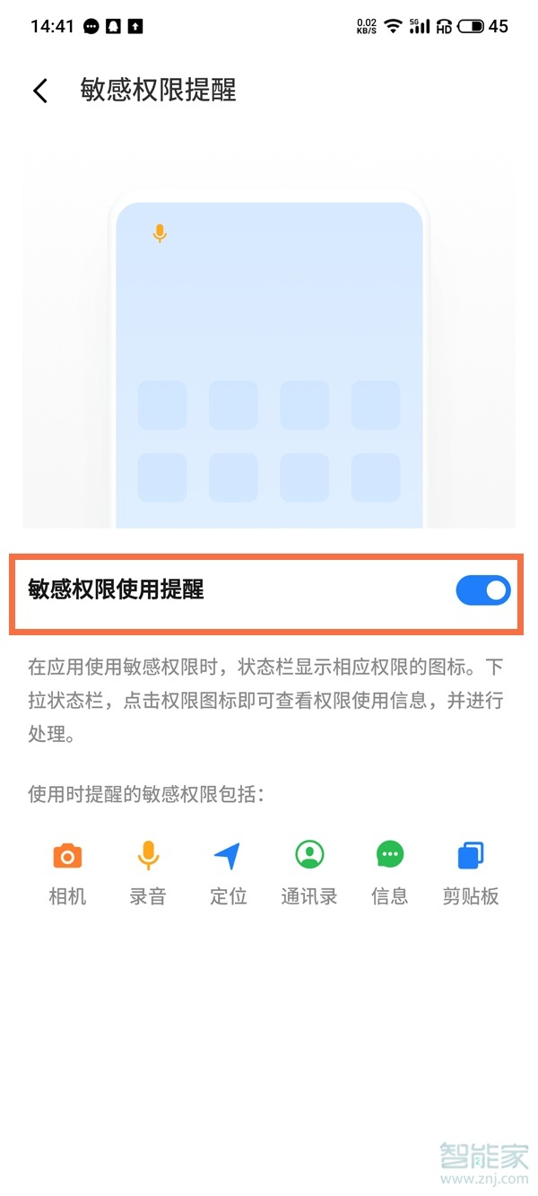 3、将【敏感权限使用提醒】开关关闭即可。