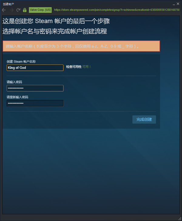 steam的账户名称长度至少为3个字符,且仅使用a-z、A-Z、0-9或者_字符,密码格式是英文字母大写、英文字母小写、数字,其需要包含其中两个,而且长度至少需要6~8位,以英文字母开头。