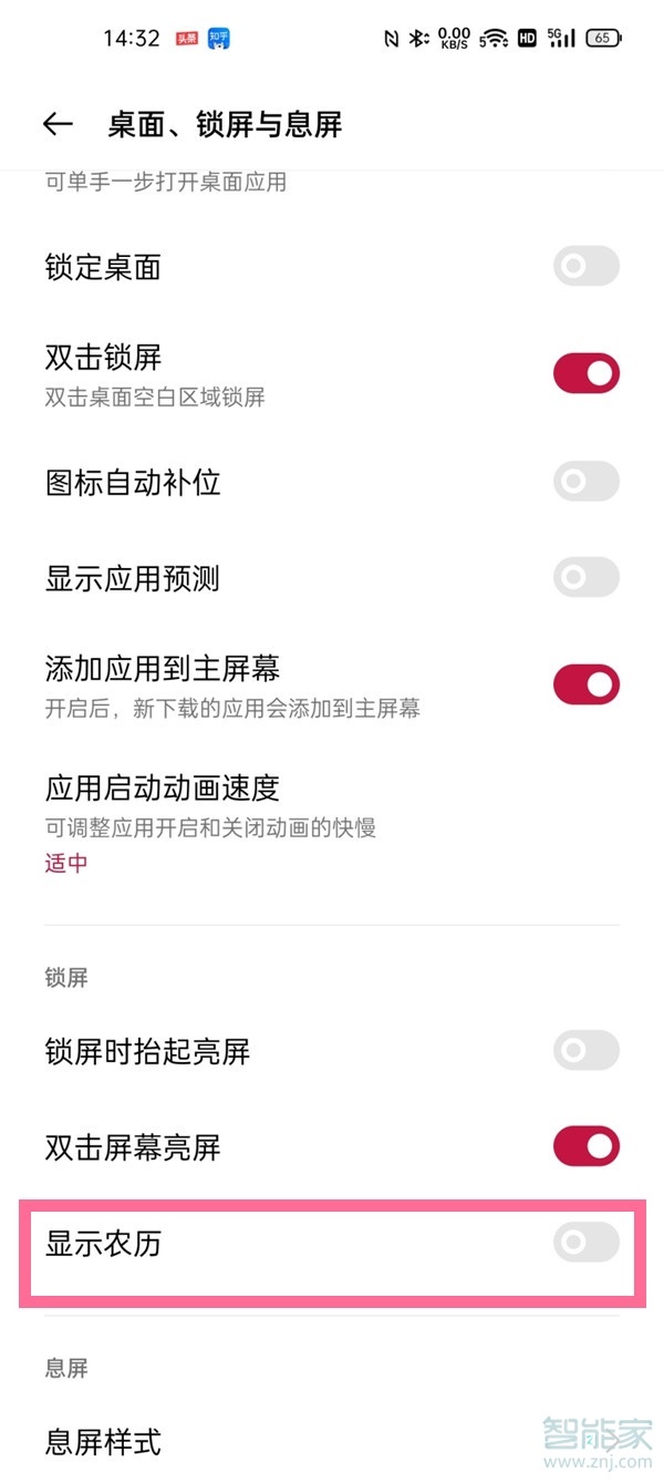 2、进入桌面、锁屏与息屏设置页面后,将【显示农历】后面的开关开启即可。