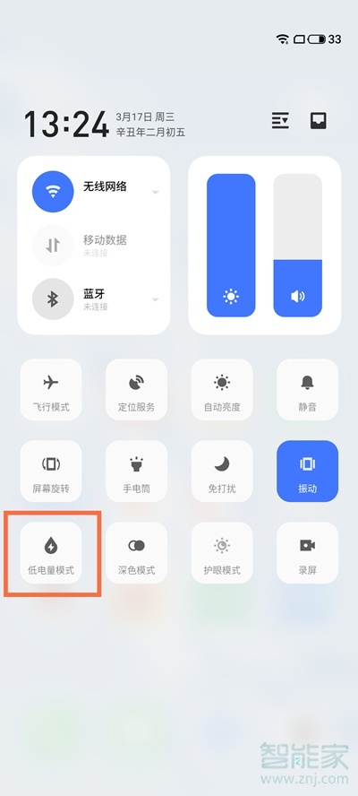 1、从手机屏幕顶部拉出状态栏。点击【低电量模式】即可。