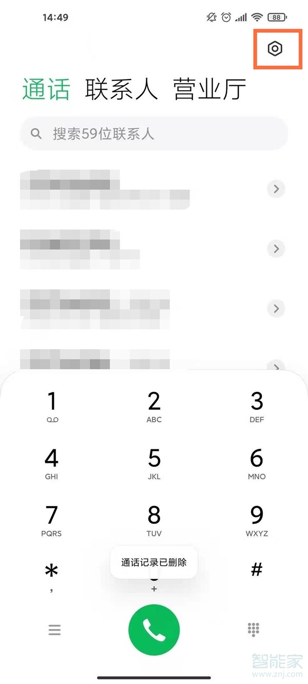 1、在桌面打开电话app,在通话页面点击右上角的设置图标。
