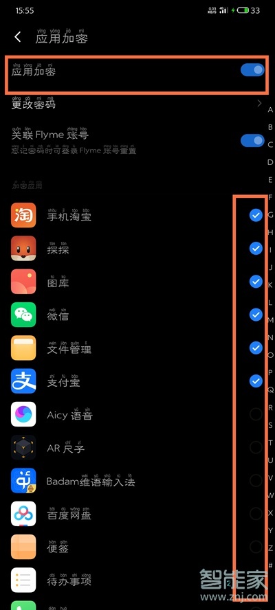 3、将应用加密的开关开启,勾选需要加密的应用即可。