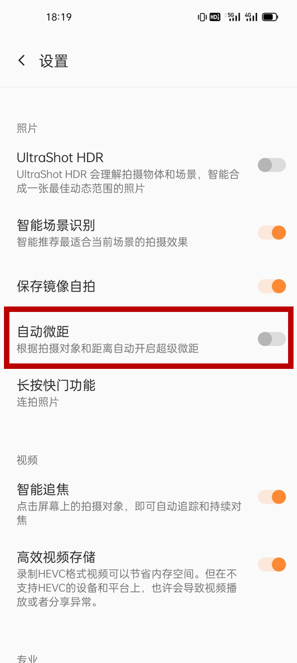 3、开启【自动微距】右侧的开关。