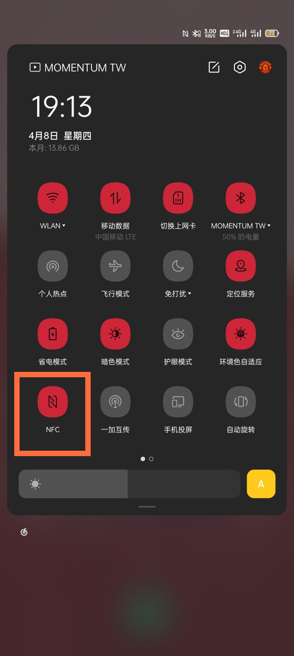 1、从屏幕顶端下拉出状态栏,点亮【NFC】图标即可。