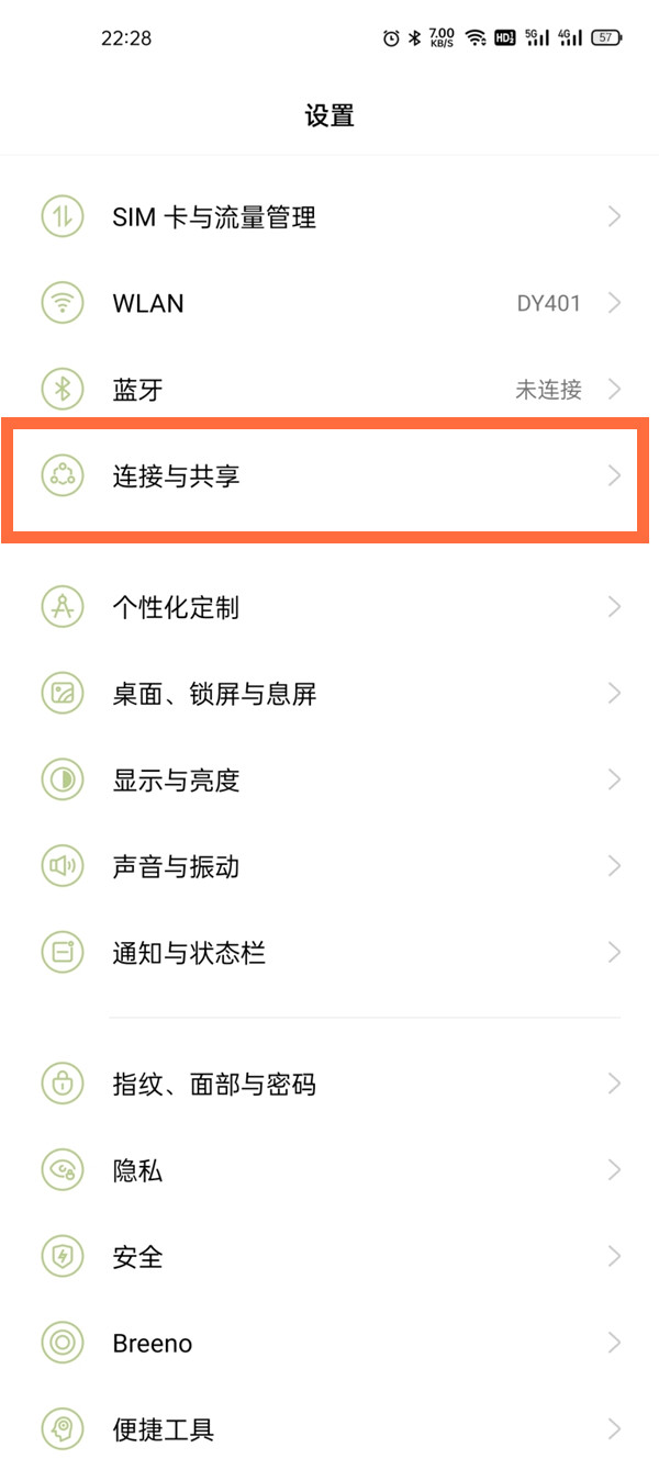 2、或者打开手机设置,点击【连接与共享】。