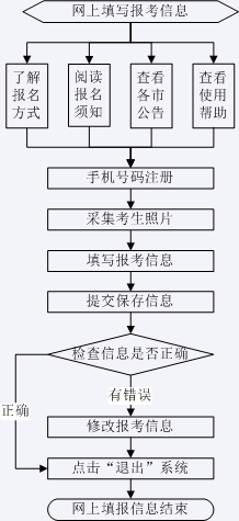 考生填写报名信息前须先进行注册、上传考生照片,然后再填报个人报考信息。网上填写报考信息操作步骤如右图所示。