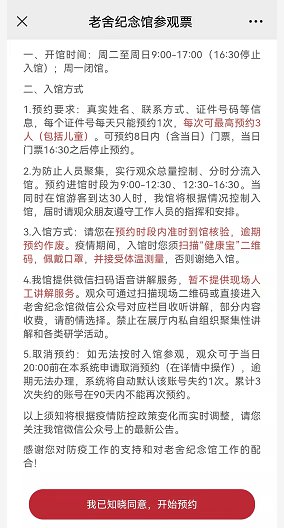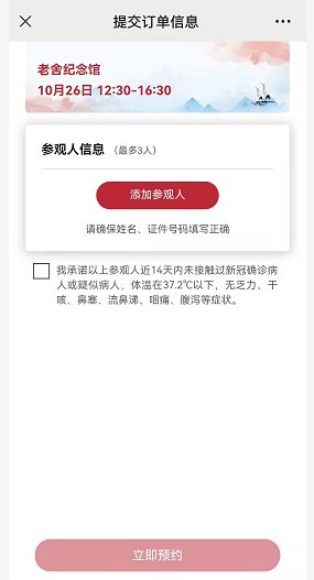 请您按照预约时段准时到馆,逾期须重新预约。本人凭有效身份证原件及预约验证信息,经过安检后入馆参观。疫情期间,入馆时您须首先扫描“健康宝”二维码,出示本人健康绿码,接受体温测量。不符合上述任一条件者谢绝入馆。