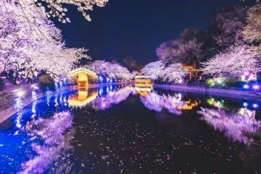 夜赏樱花是国内首创,时间一般染井吉野樱花花期,它以花朵硕大、花簇紧密著称,无边樱花海在灯光的衬托下,完整绽放的樱花像是自体发光一样,似一朵朵星花,如霞似锦,美不胜收。又犹如无数宝石镶嵌在樱花丛中。斑斓的灯影在樱花海中流光溢彩,樱花有的如朦胧剪影,有的似粉雕玉琢般晶莹剔透,有的又被彩灯装饰得五色缤纷……春风沉醉的夜晚,漫步花林中,月光、灯影、花景相互映衬,如梦似幻。