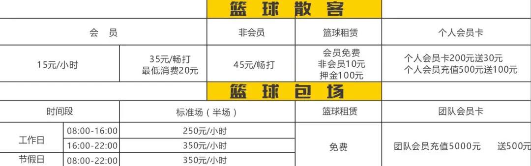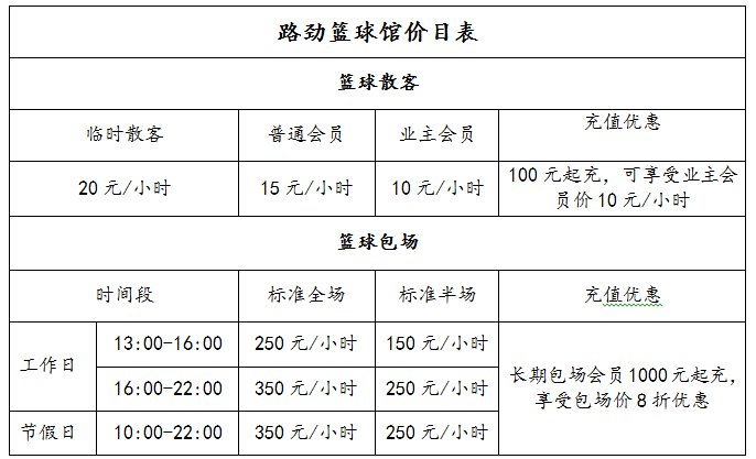 包场:标准场(半场)275元/小时、非标准场(半场)240元/小时;