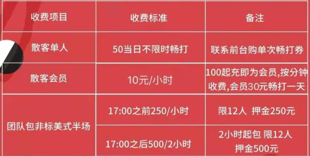 周末及节假日:500元/小时;散客50元畅打需提前电话确认场地情况。