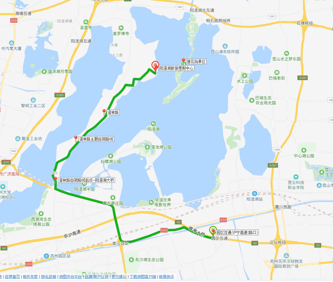 2.园区互通沪宁高速(路口)—澄林路自驾路线起点--阳澄湖大桥—澄林路主题自驾路线→澄林路→阳澄湖旅游度假中心