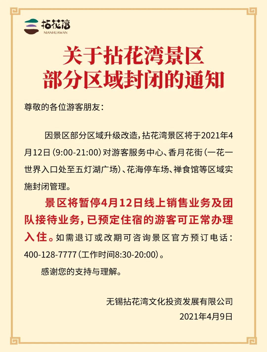 关于惠山古镇景区部分区域封闭的通知