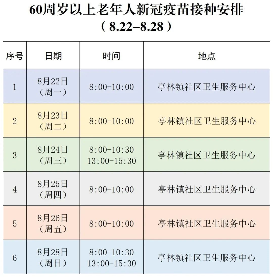 金山区亭林镇老年人新冠疫苗接种安排(8.22-8.28)