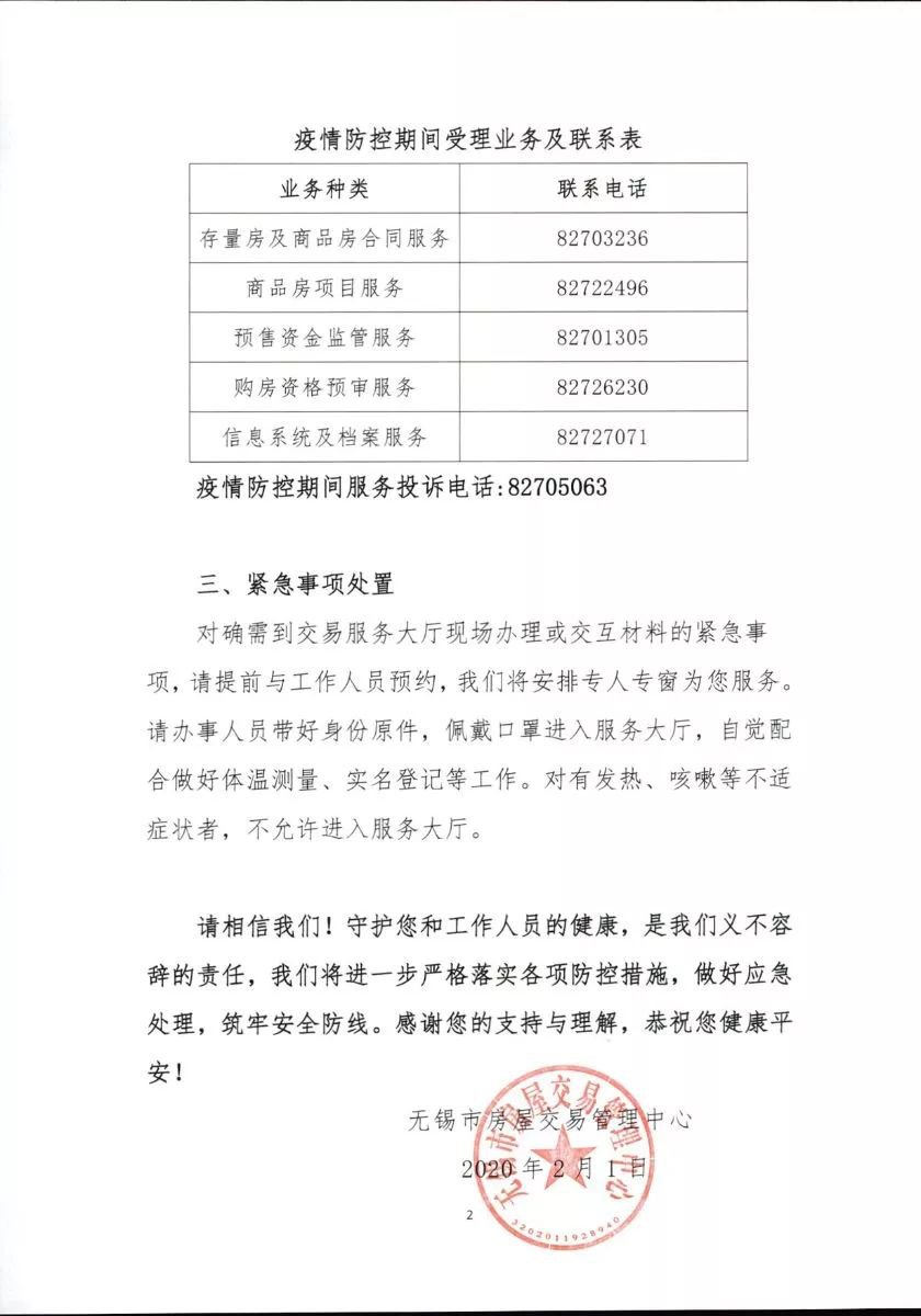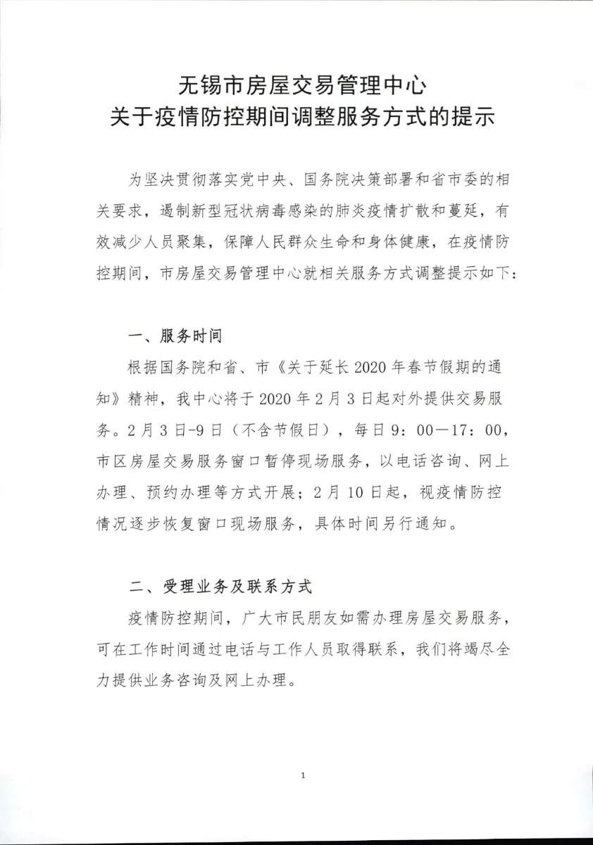 无锡市房屋交易管理中心关于疫情防控期间调整服务方式的提示