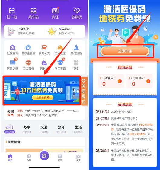 (1)即日起至4月30日,“灵锡”用户成功激活“灵锡”APP—【医保电子凭证】即可获得3张2元地铁券,