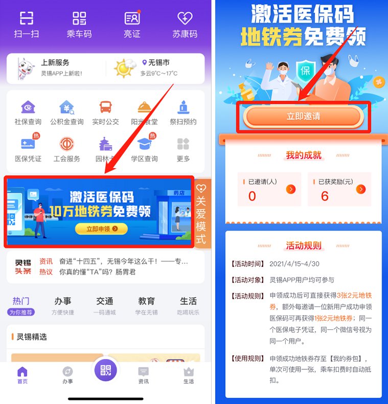 领取方式:在灵锡app激活医保码即可领取3张2元地铁券,每成功邀请一位用户激活可以再领取一张2元地铁券。