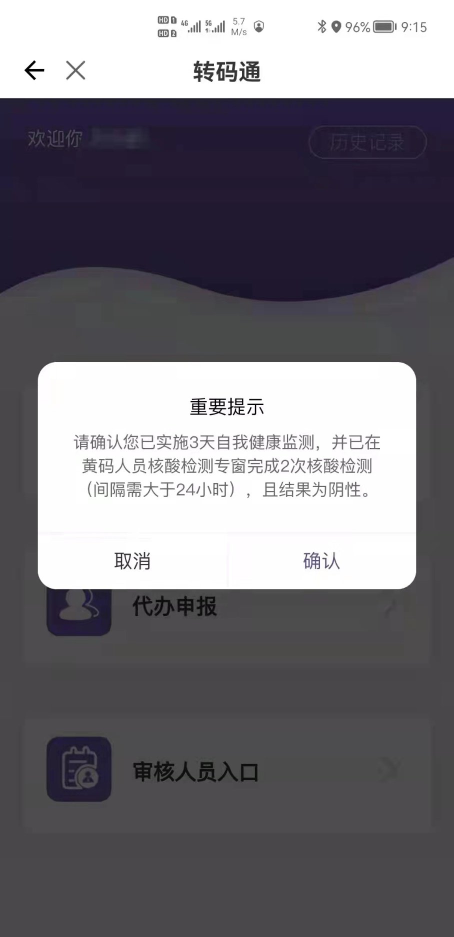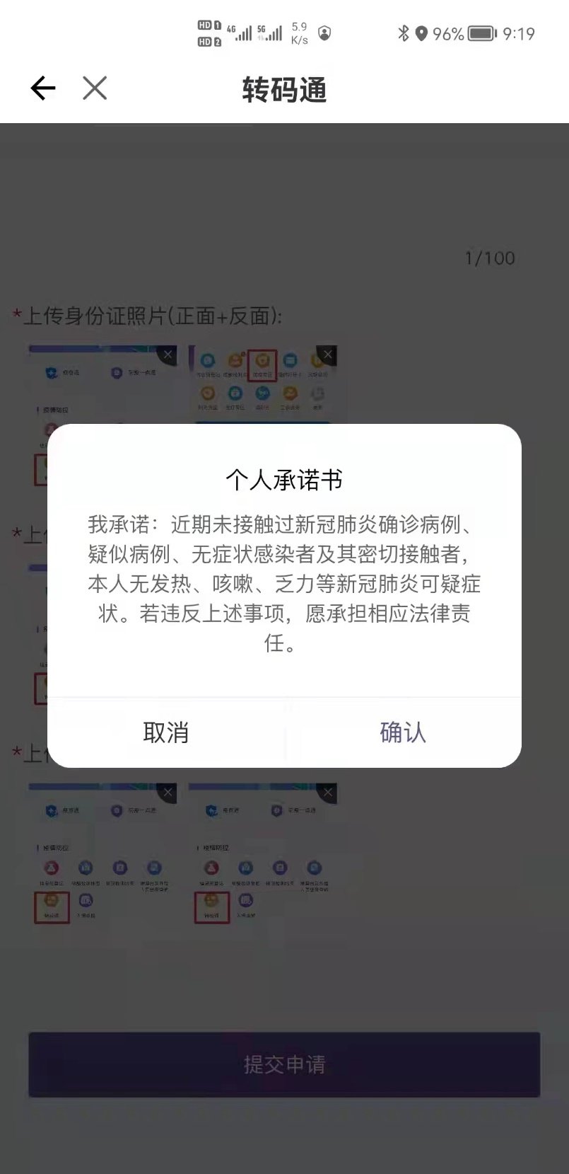 4、点击“提交申请”并确认“承诺书”疾控部门工作人员对符合要求者进行转码操作