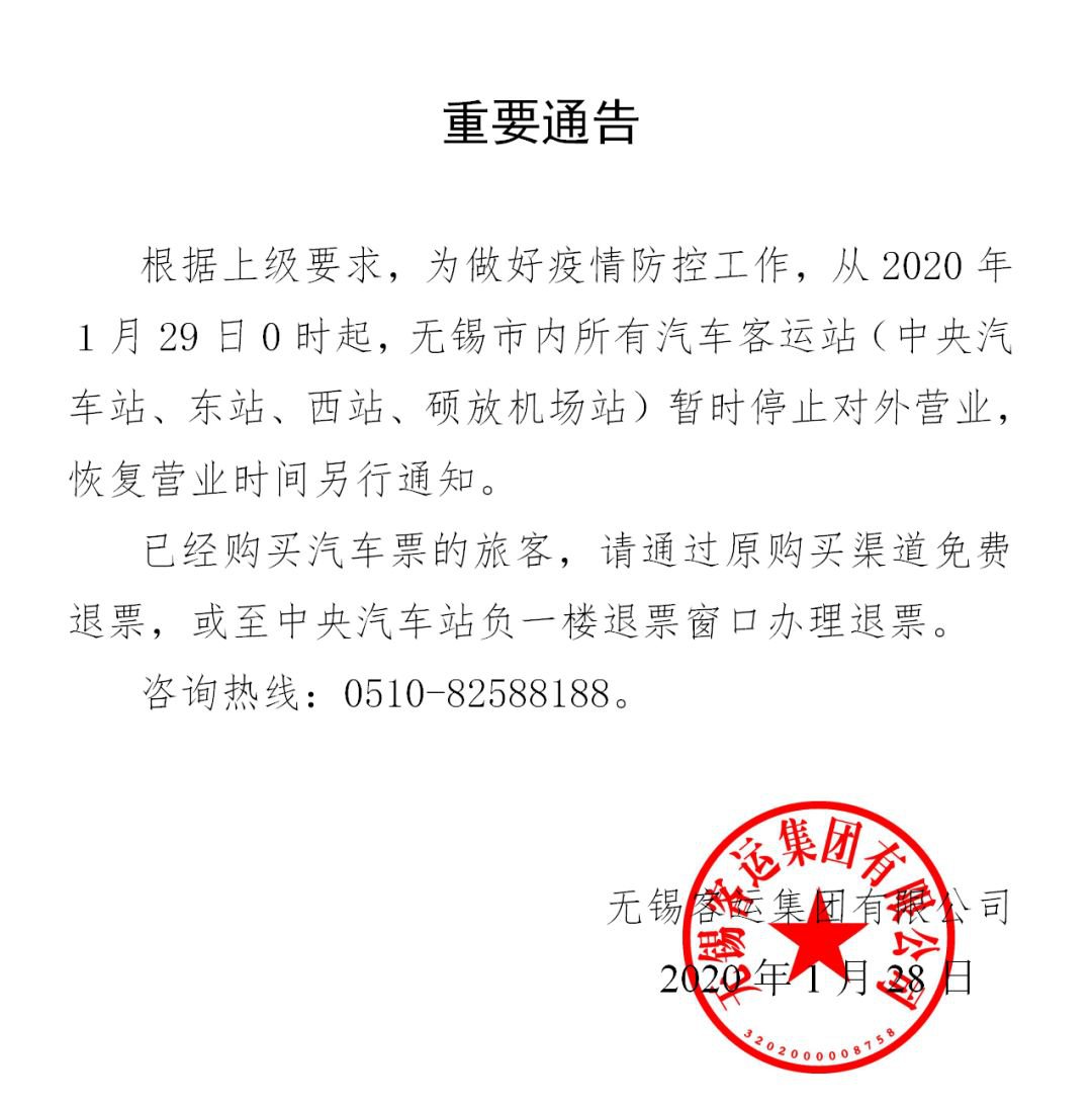 从2020年1月29日0时起,无锡市内所有汽车客运站(中央汽车站、东站、西站、硕放机场站)暂停对外营业,恢复营业时间另行通知。已经购买汽车票的旅客,请通过原购买渠道免费退票,或致中央汽车站负一楼退票窗口办理退票。咨询热线0510—82588188