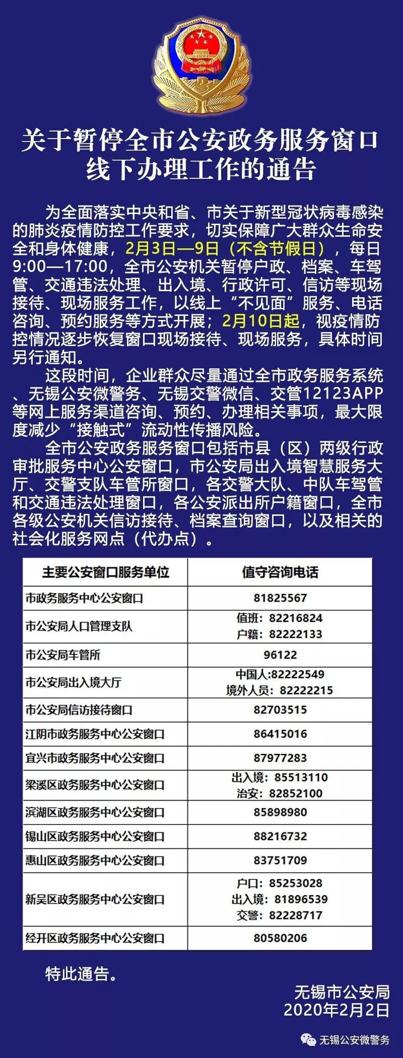 为全面落实中央和省、市关于新型冠状病毒感染的肺炎疫情防控工作要求,切实保障广大群众生命安全和身体健康,2月3日一9日(不含节假日),每日9:00- -17:00,全市公安机关暂停户政、档案、车驾管、交通违法处理、出入境、行政许可、信访等现场接待、现场服务工作,以线上"不见面”服务、电话咨询、预约服务等方式开展; 2月10日起,视疫情防控情况逐步恢复窗口现场接待、现场服务,具体时间另行通知。