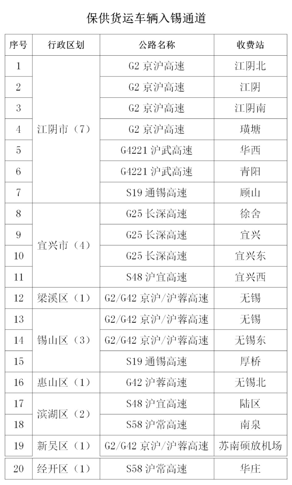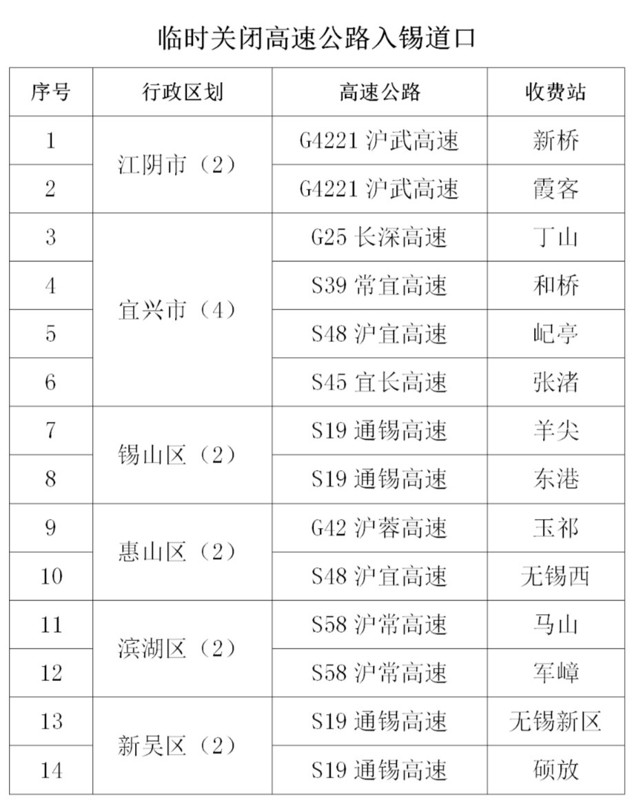 无锡境内部分高速公路入锡道口和设置公路查验点临时关闭