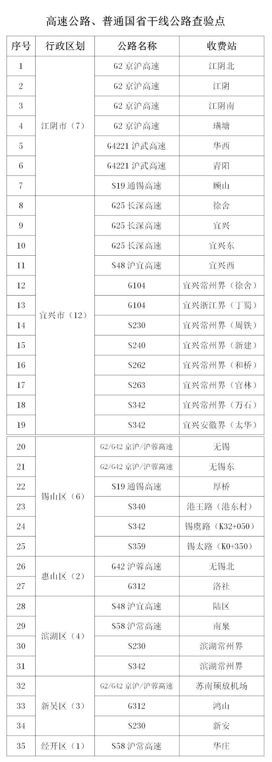 一、2022年3月14日零时起,在无锡市域范围内临时关闭14个高速公路入锡道口(见附件1),设置35个高速公路、普通国省干线公路查验点(见附件2)。对所有来锡车辆进行查验,查验车上人员行程码、健康码和48小时核酸检测阴性证明,在查验点现场进行1次核酸采样,配合做好信息登记及其他疫情防控工作。