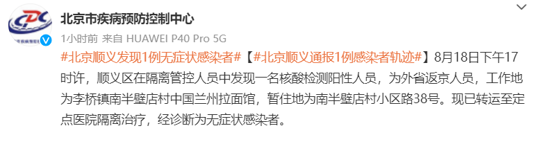 8月18日下午17时许,顺义区在隔离管控人员中发现一名核酸检测阳性人员,为外省返京人员,工作地为李桥镇南半壁店村中国兰州拉面馆,暂住地为南半壁店村小区路38号。现已转运至定点医院隔离治疗,经诊断为无症状感染者。