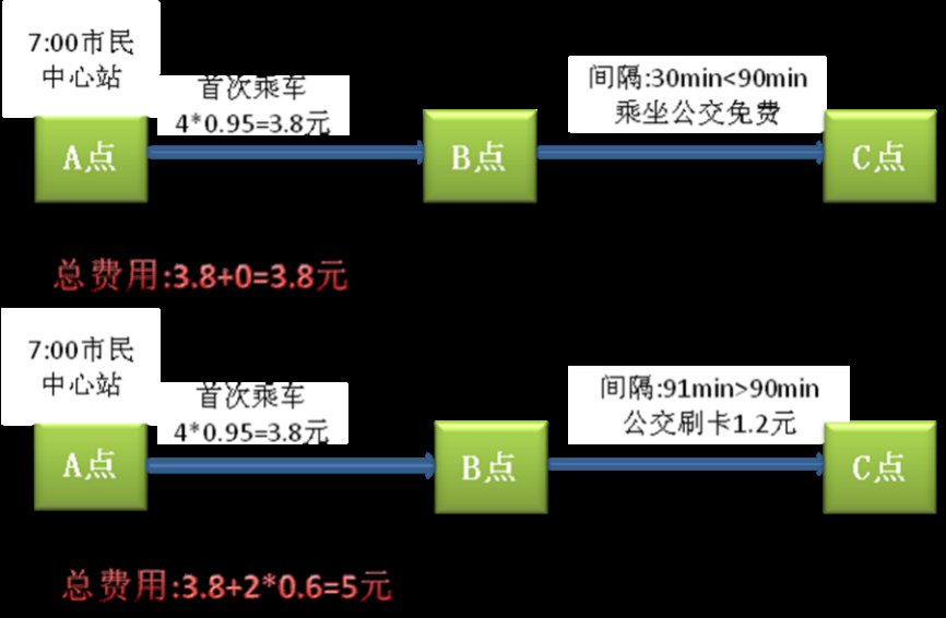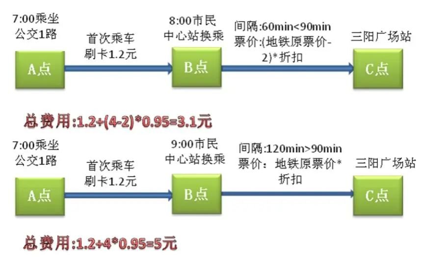 2、该次出行中,该乘客7:00在A点市民中心站乘坐地铁8:00到达三阳广场站出站,基础票价4元,支付4*0.95=3.8元;再于9:31换乘公交1路前往C点,与前次刷卡时间间隔91分钟,由于与上次刷卡时间间隔大于90min,换乘公交支付2*0.6=1.2元。本次出行总费用:5元。