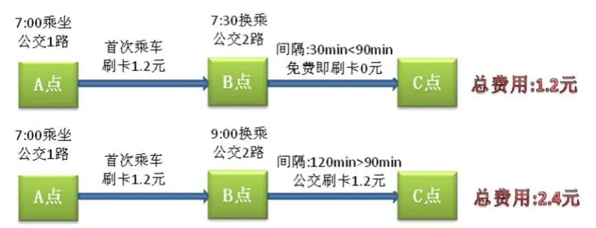 2、该次出行中,该乘客7:00在A点乘坐1路公交,刷卡支付金额1.2元(2元×0.6),到达B点后,9:00分换乘2路公交去往C点。由于与上次刷卡时间间隔大于90min,该次刷卡支付1.2元(2元×0.6)。本次出行总费用:2.4元。