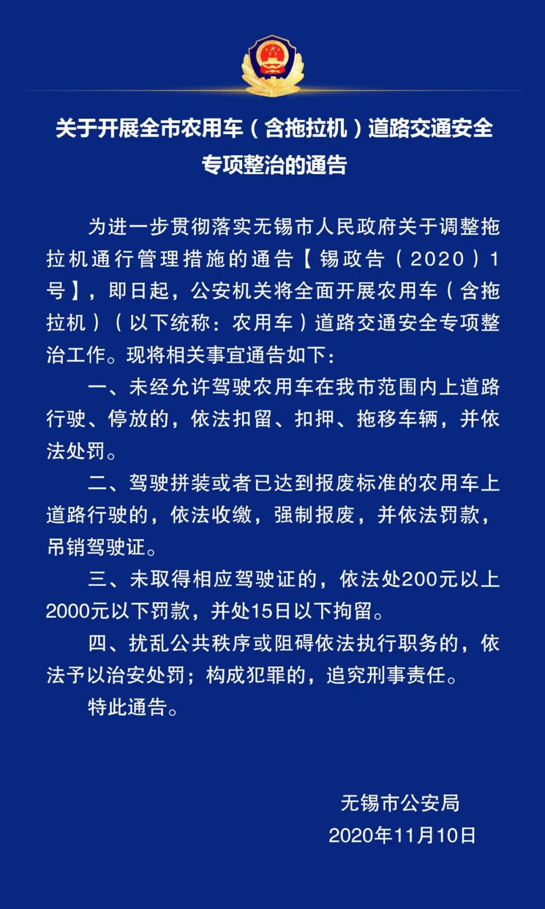 无锡关于开展全市农用车(含拖拉机)道路交通安全专项整治的通告
