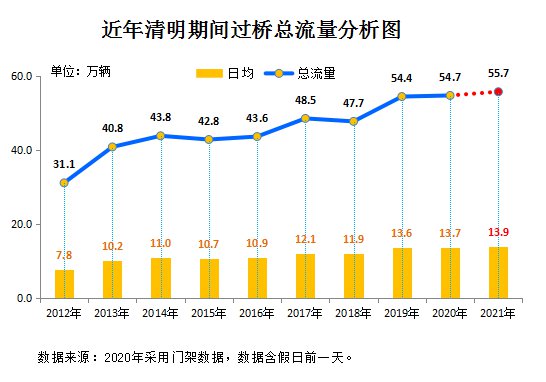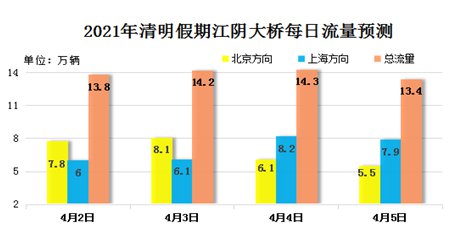 根据历史交通流量数据分析,2021年清明节假期江阴大桥预测过桥总流量将达到55.7万辆,日均达到13.9万辆