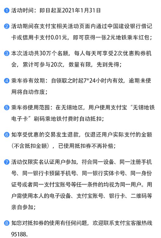 活动期间在支付宝相关活动页面内通过中国建设银行借记卡或信用卡支付0.01元,即可获得一张2元地铁乘车红包;
