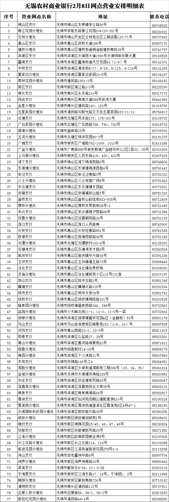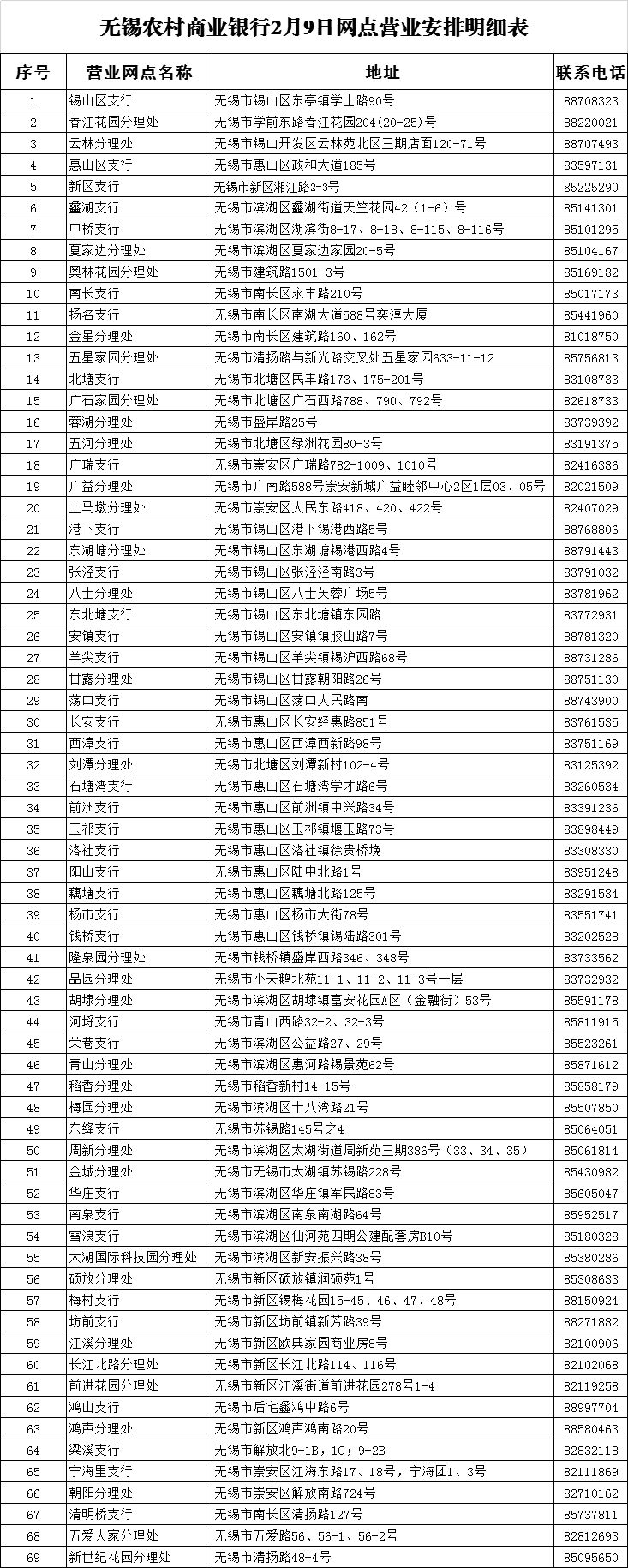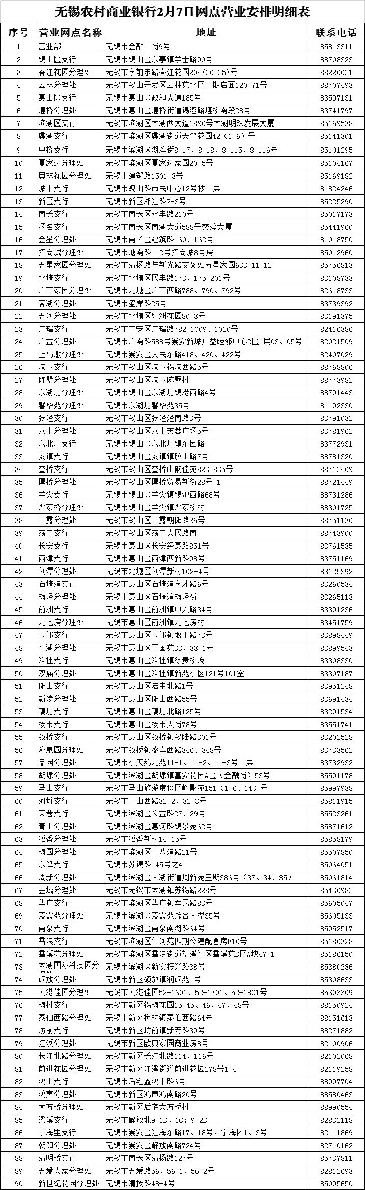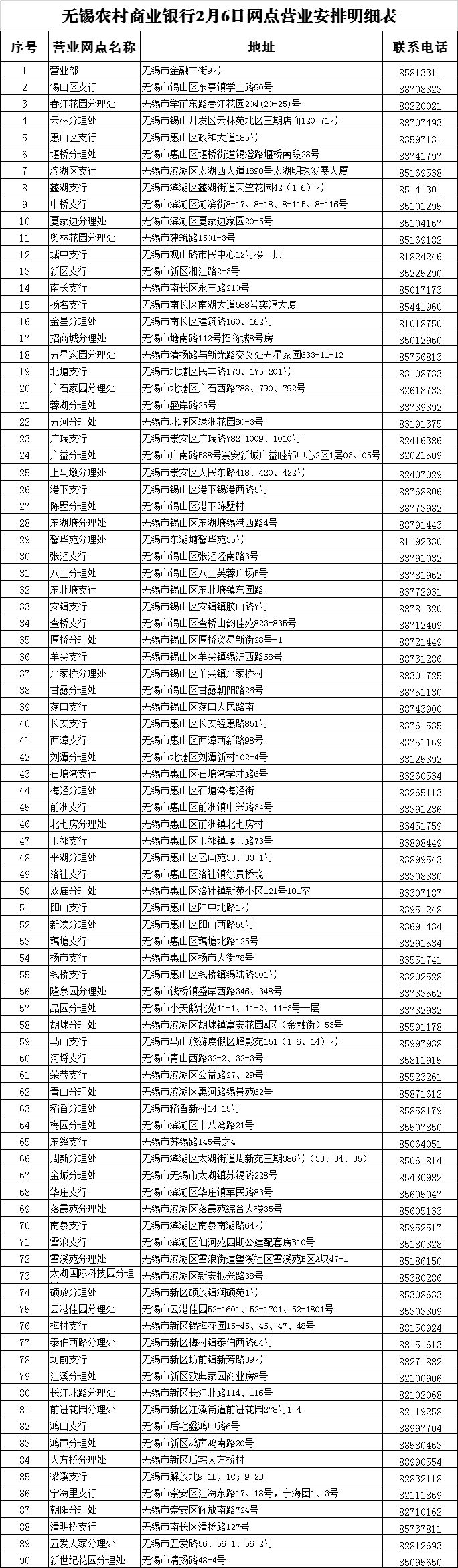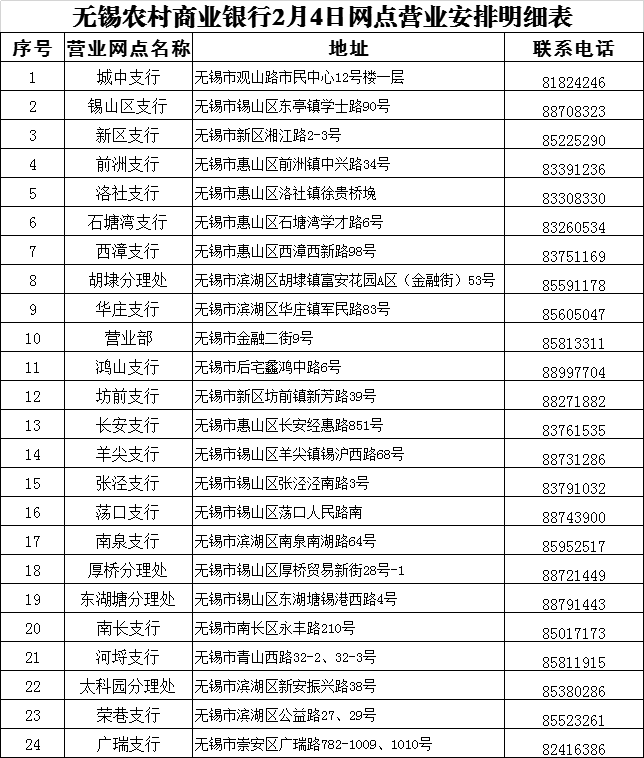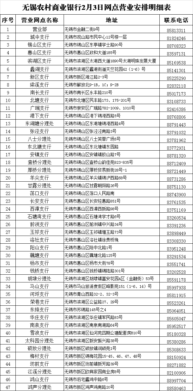 无锡农村商业银行2月3日至2月9日网点营业安排