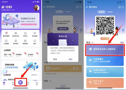 2.打开“灵锡”APP,输入注册“灵锡”时的手机号、短信验证码或密码手势或刷脸登录(若尚未注册,请先完成注册),点击“灵锡”APP首页底部二维码图标进入[数字身份]版块,完成实人认证,生成《居民身份证网上功能凭证》网证二维码作为市民出行办事的电子身份凭证。