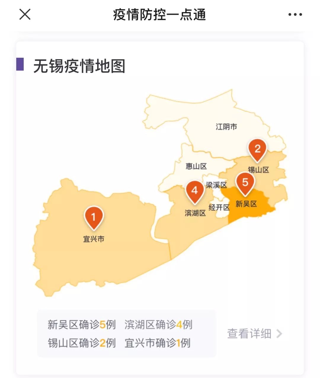 “无锡疫情地图版块”,将无锡“六区两市”疫情确诊患者数量以及分布情况一目了然的呈现在疫情地图上。想要了解更多,点击【查看详细】即可看到疫情确诊数量分布的具体新闻信息哦~