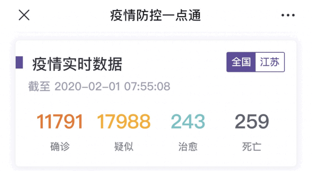 “疫情实时数据版块”,无论是全国的疫情数据,还是江苏省的疫情数据,在这里你都能查看到最即时的数据哦!仅需一键,即可随意切换全国/江苏疫情实时数据。