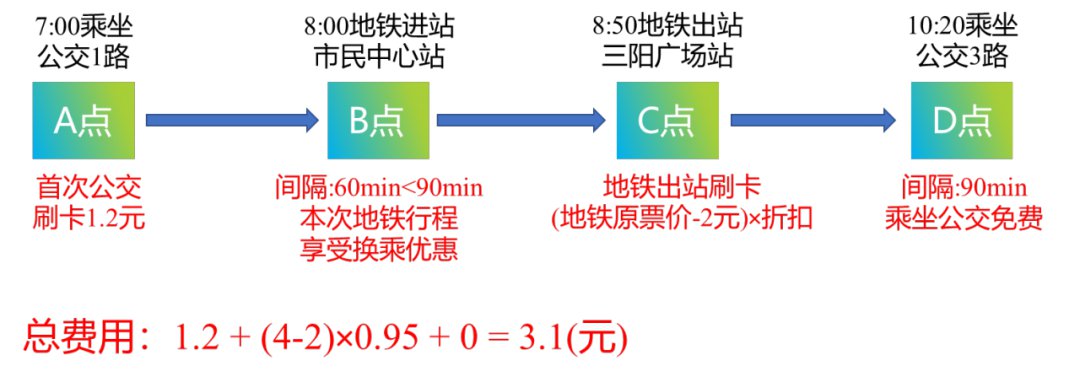 例如:苏锡常地区发行的卡享受本地公交乘车6折优惠,某乘客持江苏交通一卡通异地卡(苏锡常地区发行的卡)于7:00乘坐1路公交(票价2元),于8:00刷卡进入地铁市民中心站,于8:50刷卡离开三阳广场站(票价4元),于10:20乘坐3路公交(票价2元)。