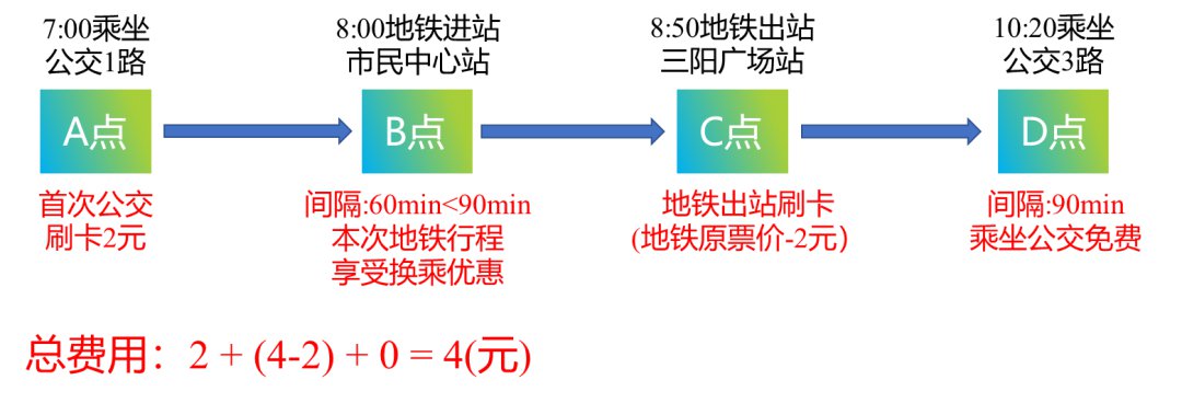 该次出行中,该乘客于7:00支付金额2元(非苏锡常地区发行的卡不享受本地公交乘车优惠,支付金额为2元),于8:50支付2元(本次地铁进站刷卡时间与上次公交刷卡时间间隔60分钟,享受换乘优惠,支付金额为4元-2元),于10:20支付0元(本次公交刷卡与上次地铁出站刷卡间隔90分钟,享受换乘优惠)。
