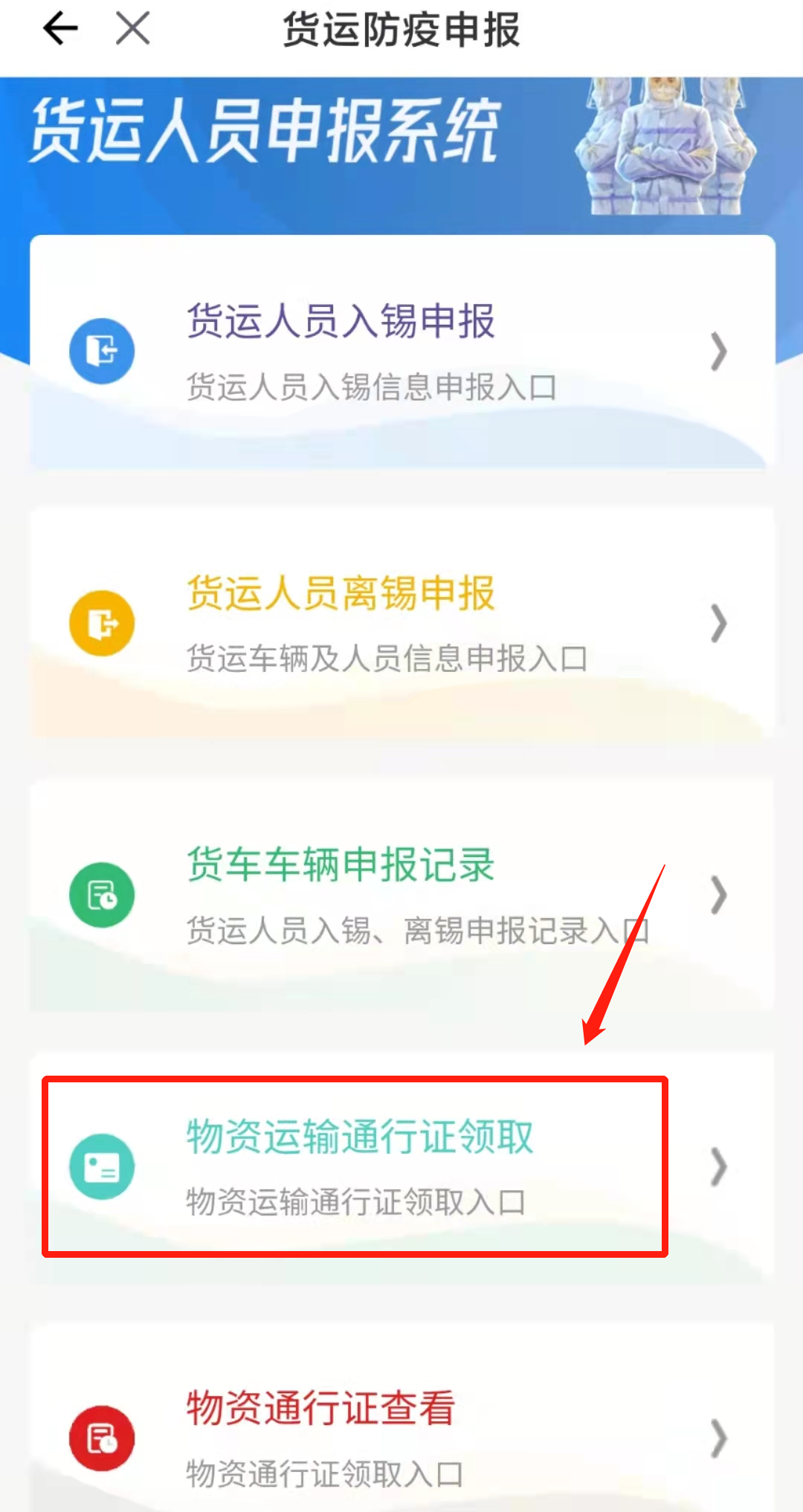 ④入锡证明:点击第四项【物资运输通行证领取】,申请提交后将由相关部门进行审核审核通过后可查看通行证